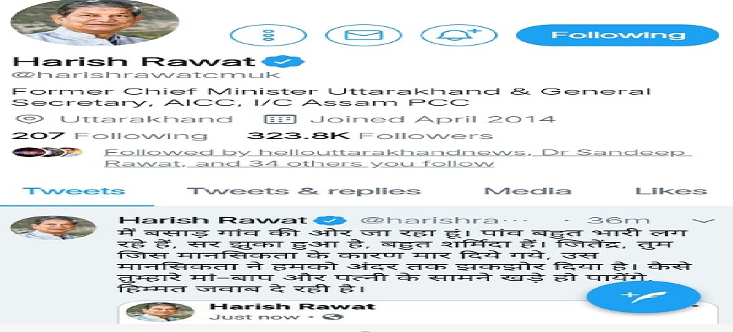 देहरादून: उत्तराखंड के कांग्रेस प्रदेश अध्यक्ष गणेश गोदियाल के बाद ट्विटर ने अब कांग्रेस के राष्ट्रीय महासचिव और उत्तराखंड के पूर्व मुख्यमंत्री हरीश रावत का अकाउंट भी ब्लॉक कर दिया है। इसकी जानकारी खुद हरीश रावत ने अपने दूसरे सोशल मीडिया अकाउंट पर शेयर कर के दी है। बता दें कि मंगलवार को उत्तराखंड कांग्रेस के प्रदेश अध्यक्ष गणेश गोदियाल का ट्विटर अकाउंट भी ब्लॉक कर दिया गया था। वहीं हरीश रावत ने अपनी पोस्ट में लिखा है कि ‘लोकतंत्र में मुझे चुप कराने की कोशिश की जा रही है। मैंने मुहिम के तहत ‘मैं भी राहुल हूं’ को लेकर एक दलित परिवार का जिक्र करते हुए ट्वीट किया था। ट्विटर इंडिया ने मेरा ट्विवटर अकाउंट ब्लॉक कर दिया है। वहीं यह शर्त रखी है कि जब उक्त पोस्ट हटा दिया जाएगा तो मेरा अकाउंट चालू हो जाएगा।