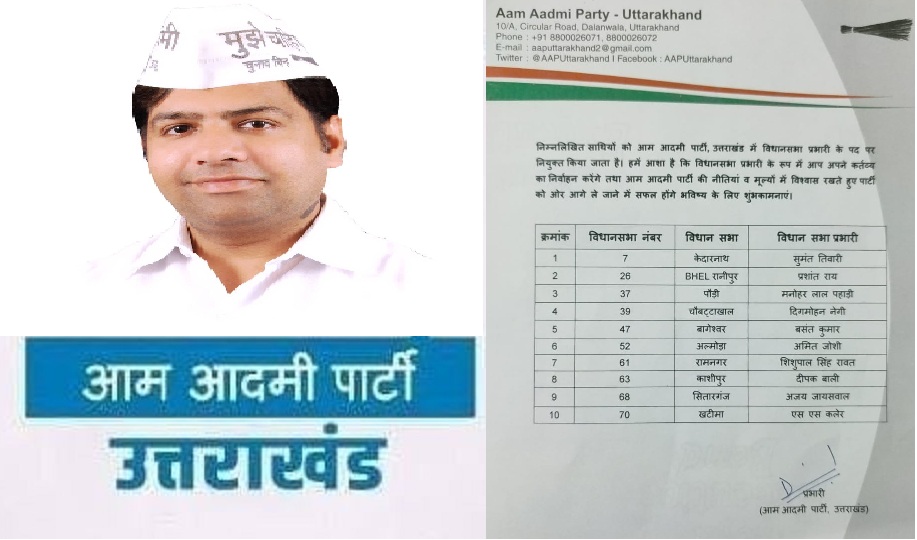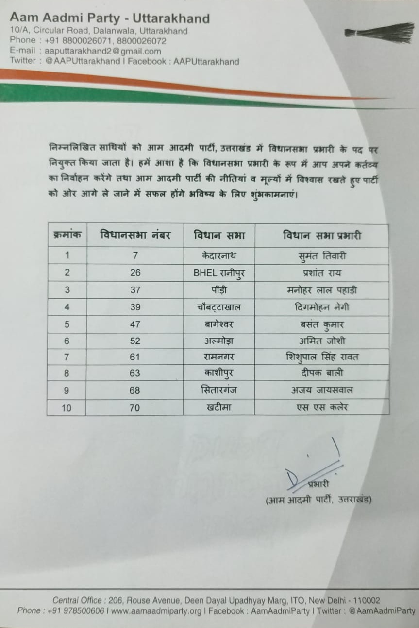 विधानसभा चुनावों को देखते हुए आप पार्टी द्वारा पहले चरण में 10 विधानसभाओं के लिए प्रभारी नियुक्त किए गए ,ताकि पार्टी का संगठन और पार्टी की आगामी रणनीतियों पर बेहतर काम कर सकें। आप प्रभारी द्वारा जारी इस लिस्ट में 4 गढ़वाल और 6 कुमाऊं की विधानसभाओं में प्रभारी नियुक्त किए गए। गढ़वाल की 4 विधानसभाओं में केदारनाथ से सुमंत तिवारी, चौबट्टा खाल से दिग्मोहन नेगी,पौडी से मनोहर लाल पहाडी,भेल रानीपुर हरिद्वार से प्रशांत राय शामिल हैं जबकि कुमाऊं की 6 विधानसभाओं में बागेश्वर से बसंत कुंमार, अल्मोडा से अमित जोशी,रामनगर से शिशुपाल रावत,काशीपुर से दीपक बाली,खटीमा से एस एस कलेर, और सितारगंज से अजय जयसवाल को विधानसभा प्रभारी बनाया गया है।