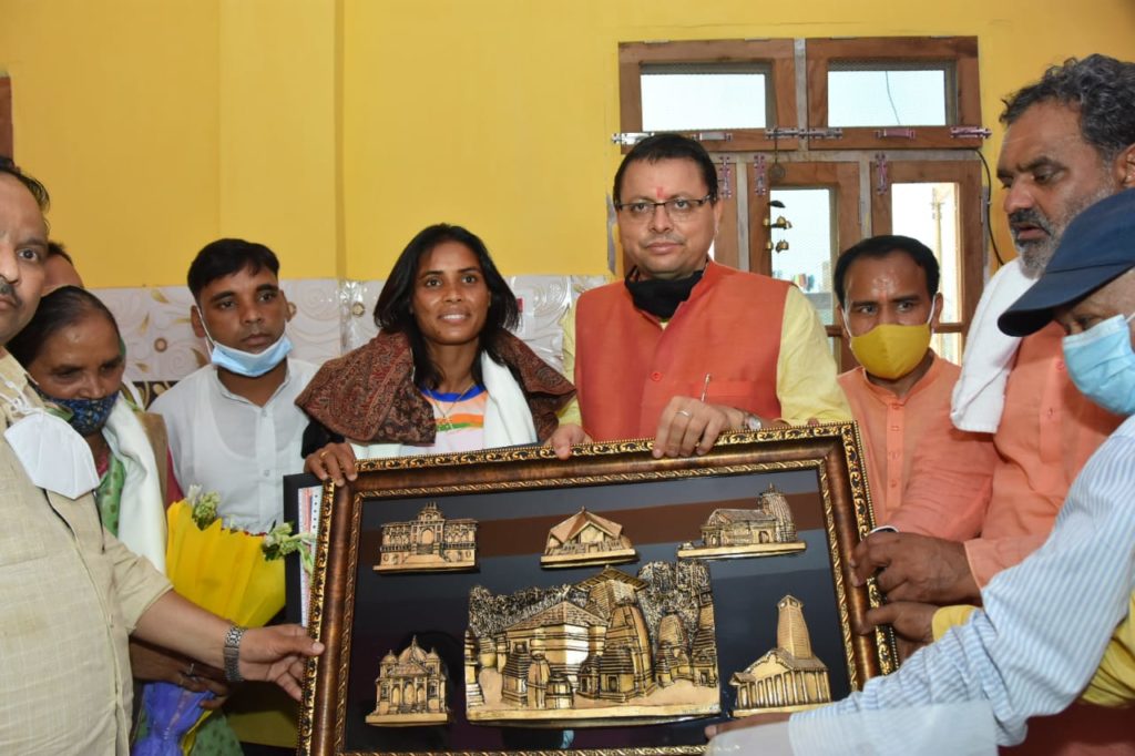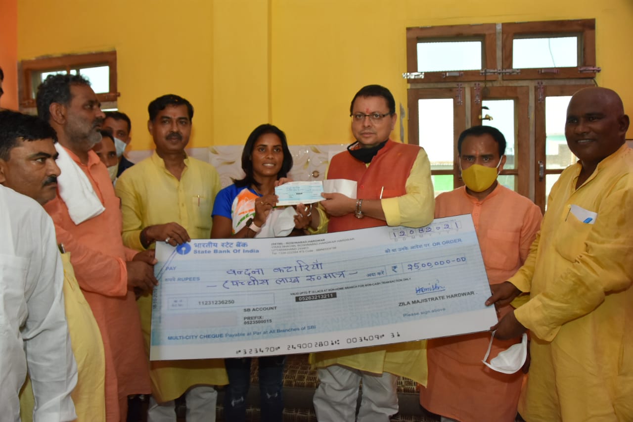 हरिद्वार: मुख्यमंत्री पुष्कर सिंह धामी ने भारतीय महिला हॉकी खिलाड़ी सुश्री वन्दना कटारिया के रोशनाबाद, हरिद्वार स्थित आवास पर जाकर टोकियो ओलंपिक में वंदना के शानदार प्रदर्शन पर उन्हें बधाई दी। मुख्यमंत्री पुष्कर सिंह धामी ने सुश्री वन्दना कटारिया को 25 लाख रूपये का चेक प्रदान किया। इस अवसर पर मुख्यमंत्री ने वन्दना कटारिया को तीलू रौतेली पुरस्कार से भी सम्मानित किया। इसके तहत उन्हें 31 हजार रूपये का चेक एवं प्रशस्ति पत्र प्रदान किया। वंदना कटारिया को महिला सशक्तीकरण के तहत ‘‘बेटी बचाओ, बेटी पढ़ाओ अभियान का ब्रांड एम्बेसडर भी बनाया गया है।