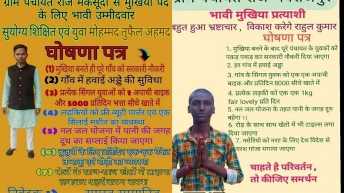 इंटरनेट पर इन दिनों पंचायत चुनाव के लिए नामांकन भरने वाले उम्मीदवार युवा मोहम्मद तुफैल अहमद की घोषणाओं का पोस्टर जमकर वायरल हो रहा है। उन्होंने प्रधानी जीतने के लिए गाँव वालों से गजब के वादे किए हैं। घोषणा पत्र का स्लोगन भी दिलचस्प है, इसमें लिखा है, “आप रखिए हम पर विश्वास, एक-एक का होगा विकास।” आगे लिखा है, “ग्राम पंचायत राज मकसूदा से मुखिया पद के भावी उम्मीदवाद सुयोग्य, शिक्षित एवं युवा मोहम्मद तुफैल अहमद।”