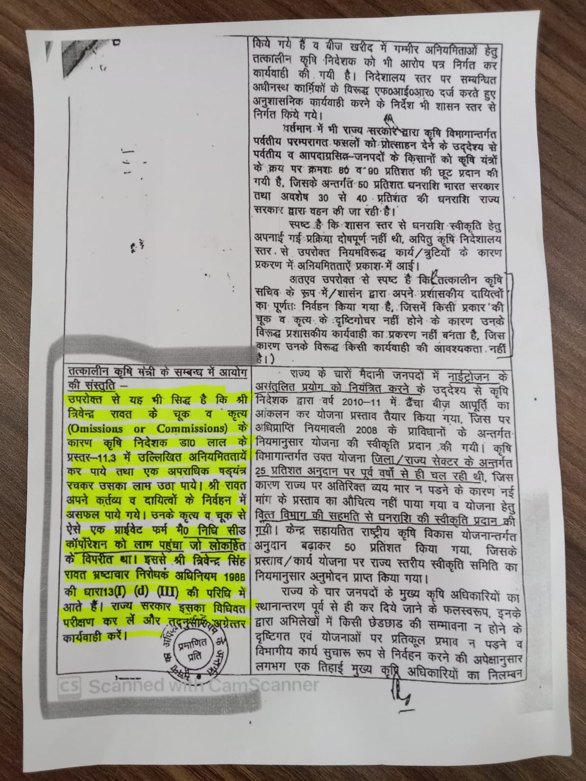 खुद मुख्यमंत्री रहते हुए हरीश रावत ने भी त्रिवेन्द्र सिंह रावत और उन सभी अधिकारियों का बचाव किया जो इस बडे घोटाले में संलिप्त थे। ढैंचा बीज घोटाला 2009-10 में सामने आया था, जिस दौरान कृषि मंत्री रहते हुए त्रिवेन्द्र सिंह रावत द्वारा बाजार मूल्य से ऊपर ढैंचा बीज खरीदा गया और इससे सरकार को काफी नुकसान उठाना पडा था। विजय बहुगुणा के कार्यकाल में इस घोटाले के ऊपर त्रिपाठी आयोग बनाया गया ,जिसने अपनी रिपोर्ट में यह स्पष्ट लिखा था कि ढैंचा बीज खरीद में घोटाला हुआ है लिहाजा त्रिवेन्द्र सिंह रावत पर कार्रवाई होनी चाहिए। लेकिन विजय बहुगुणा के बदलते ही ,हरीश रावत मुख्यमंत्री बने और उन्होंने इस जांच को दबा दिया और उनकी और त्रिवेन्द्र सिंह रावत की नजदीकियां किसी से छिपी नहीं हैं। इसके बाद 2017 में प्रदेश में भाजपा की सरकार बनी और त्रिवेंद्र सिंह रावत मुख्यमंत्री बने, तब भाजपा सरकार ने तमाम सबूतों को दरकिनार करते हुए त्रिपाठी आयोग की रिपोर्ट को खारिज कर दिया और त्रिवेंद्र सिंह रावत को क्लीन चिट दे दी।