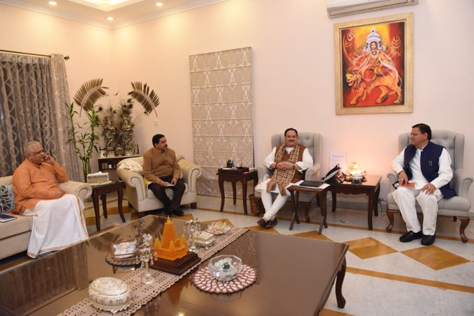 भारत के यशस्वी प्रधानमंत्री श्री @narendramodi जी के आगामी उत्तराखण्ड आगमन एवं जनसभा के सम्बन्ध में आज दिल्ली में @BJP4India के माननीय अध्यक्ष श्री @JPNadda जी, राष्ट्रीय संगठन महामंत्री श्री @blsanthosh जी एवं उत्तराखण्ड चुनाव प्रभारी श्री @JoshiPralhad जी से मिलकर चर्चा की। pic.twitter.com/9YJaTtbK4e