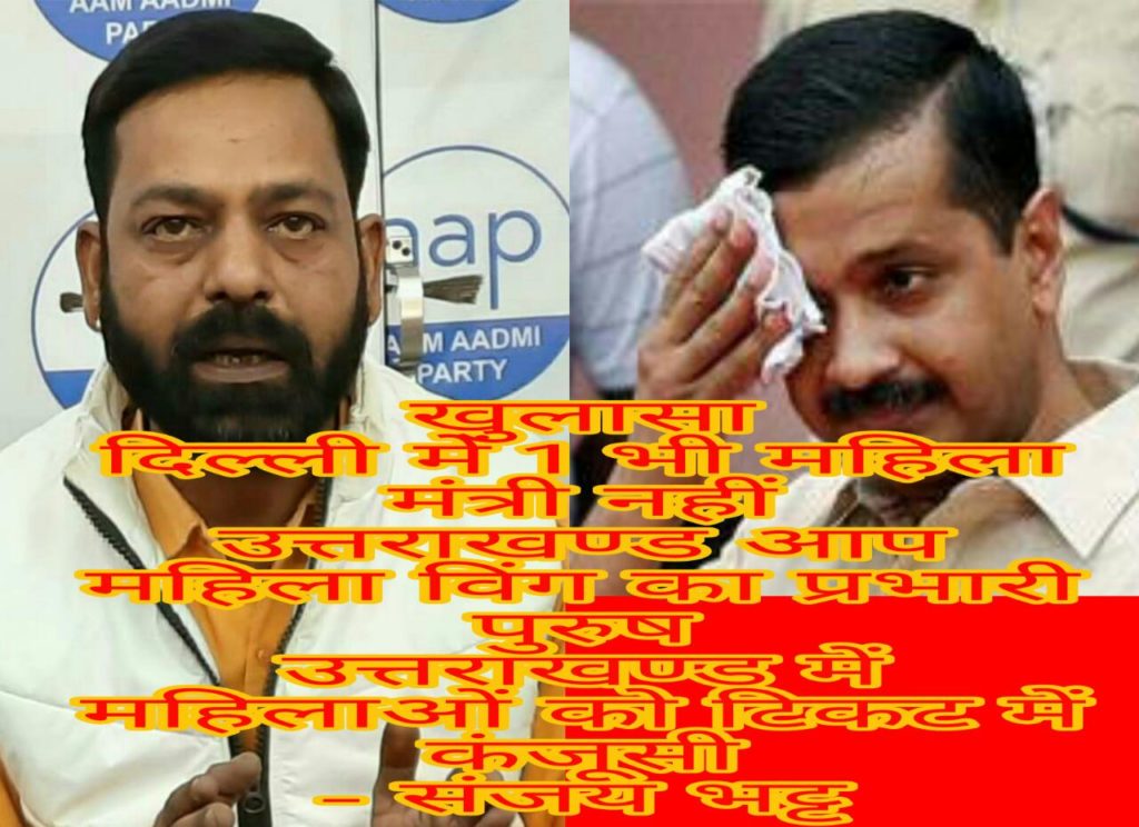 उत्तराखण्ड की मातृशक्ति से अपील है कि ऐसी पुरुष वादी सोच की पार्टी को उत्तराखण्ड ‘जिसे महिलाओं की कुर्बानी से हासिल किया गया’ में घुसने से रोकें वरना एक दिन उत्तराखण्ड की कन्या प्रजनन दर भी केजरीवाल के ग्रह राज्य हरियाणा की तरह ही होगी, जहां 1000 परुषों पर मात्र 837 महिला हैं, हरियाणा देश मे 31वें नम्बर पर है। अरविंद केजरीवाल के काम भी वैसे ही प्रतीत हो रहे हैं। न दिल्ली में महिला मंत्री, न उत्तराखण्ड में महिलाओं को टिकट आवंटन में उचित प्रतिनिधित्व, न पार्टी की उत्तराखण्ड विंग में महिला अध्यक्ष, और तो और महिला विंग का प्रभारी पुरुष।