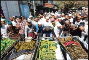बुधवार की दोपहर जब एक ही मोहल्ले से सैकड़ों लोगों की मौजूदगी में दो घरों से चार जनाजे एक साथ उठे तो माहौल गमगीन हो गया। परिवार की महिलाओं व बच्चों की चीख-पुकार सुनकर मौजूद लोगों की आंखों से आंसू बहने लगे। चारों जनाजे को कंधा देने के लिए लोगों की लंबी कतार लग गई। मुनीम चौक पर चारों जनाजों की अलग-अलग नमाज अदा की गई। बाद में चारो शवों को कब्रिस्तान में सुपुर्द ए खाक कर दिया गया। इस मौके पर नगीना लोकसभा क्षेत्र के बसपा सांसद गिरीश चंद, नगर पालिका परिषद नगीना की चेयरपर्सन के पुत्र शेख शाहनवाज खलील, सेवानिवृत्त आईएएस आरके सिंह, सना ग्रुप के चेयरमैन सरफराज अंसारी, हाजी खुर्शीद अहमद कुरैशी, इश्तियाक अहमद बाबू भाई, शेख जमशेद ठेकेदार, आरिफ उस्मानी, शेख सद्दन ठेकेदार, अब्दुल कय्यूम राईन, बदर मुनीम आदि मौजूद रहे।