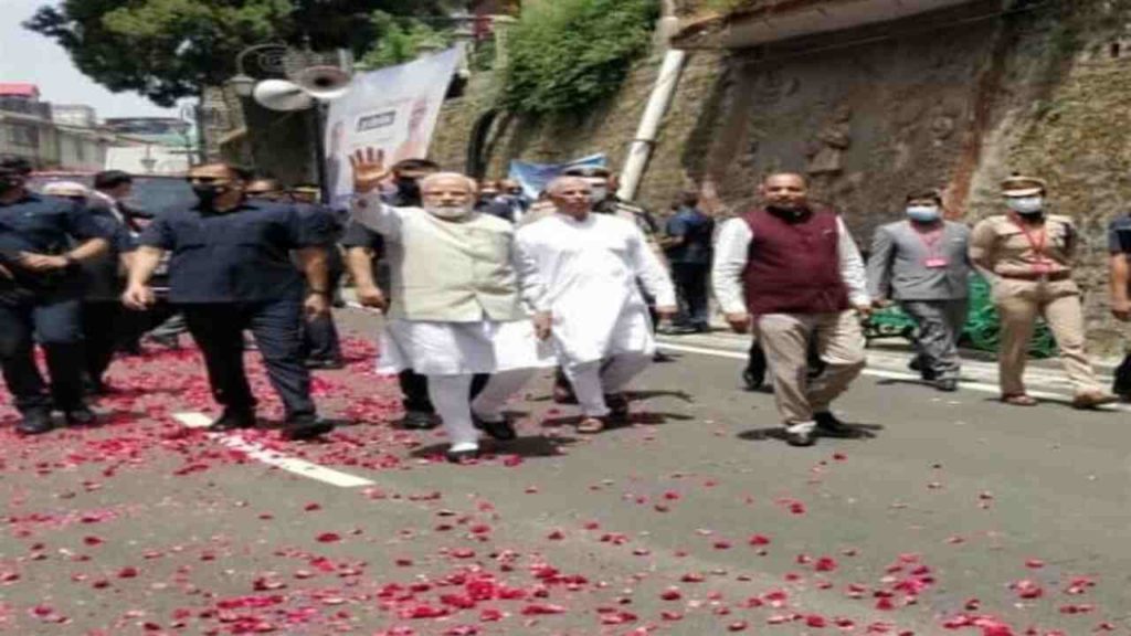 शिमला : प्रधानमंत्री नरेन्द्र मोदी के शिमला में रोड शो के दौरान सड़क किनारे खड़े लोगों ने फूलों की बारिश की। हालांकि प्रधानमंत्री सुरक्षा कारणों से खुली गाड़ी में सवार नहीं हुए। गाड़ी के अंदर बैठकर ही पीएम मोदी ने लोगों का अभिवादन स्वीकार किया। सीटीओ चौक से नरेंद्र मोदी का रोड शो शुरू हुआ। सुरक्षा कर्मी वाहन के साथ चलते रहे। लोगों ने फूल बरसा कर नरेंद्र मोदी का स्वागत किया। स्कैंडल प्वाइंट पर प्रधानमंत्री का काफिला रोका गया था। प्रधानमंत्री गाड़ी से उतरे व पैदल चले। इस दौरान उन्होंने हाथ हिलाकर लोगों का अभिनंदन स्वीकार किया। लोगों का उत्साह देखकर मोदी गाड़ी से उतर गए व कुछ दूरी तक पैदल चलकर लोगों का अभिवादन स्वीकार किया।