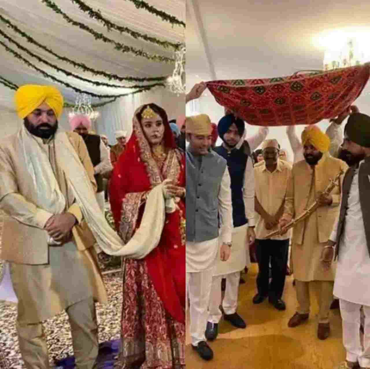 समाचार एजेंसी एएनआई के अनुसार आमतौर पर शादियों में रहने वाले ‘बैंड, बाजा, बारात’ गायब थे लेकिन उत्सव का माहौल कायम था. टेलीविजन और ट्विटर पर आए फोटो में सीएम भगवंत मान और उनकी दुल्हन को आनंद कारज समारोह में लाल रंग के कपड़े पहने हुए दिखाया गया है.