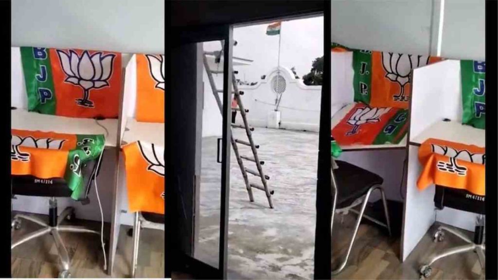 लखनऊ: लखनऊ में यूपी कांग्रेस के प्रदेश मुख्यालय में बीजेपी के झंडे मिले हैं और इस घटना का एक वीडियो सोशल मीडिया पर वायरल हो गया है। कांग्रेस के पूर्व नेता जीशान हैदर ने घटना का एक वीडियो ट्वीट किया, जिसमें कांग्रेस पार्टी के कार्यकर्ता खड़े नजर आ रहे हैं और आश्चर्य से देख रहे हैं। प्रदेश कांग्रेस के कार्यालय में सत्तारूढ़ भारतीय जनता पार्टी का झंडा पाए जाने पर विवाद गहरा गया है। पार्टी ने इसे साजिश बताते हुए जांच कराए जाने की बात कही है। दरअसल मॉल एवेन्यू स्थित प्रदेश कांग्रेस के दो मंजिला मुख्यालय में दूसरे तल पर सोशल मीडिया का कार्यालय है। इस कार्यालय के एक कमरे में ही कुर्सियों और सामने की डेस्क पर भाजपा के झंडे पड़े मिले। इसका वीडियो वायरल होने के बाद पार्टी में हड़कंप मच गया।