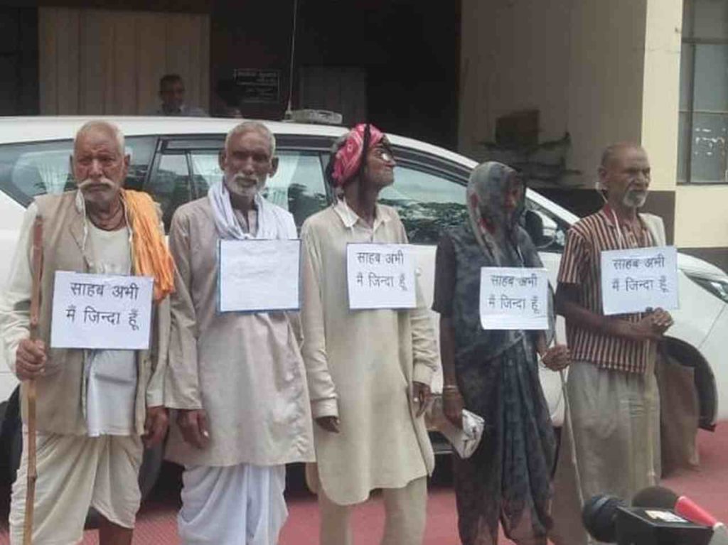 महोबा: उत्तर प्रदेश के महोबा से एक हैरानी करने वाली खबर सामने आई है। यहां गांव के 6 लोगों को मृत घोषित कर दिया, जबकि वह जिंदा है। खुद अपने गले में ‘मैं अभी जिन्दा हूं’ की तख्ती लटकाकर छः बुजुर्ग जब डीएम कार्यालय के बाहर पहुंच गये तो मामला संज्ञान में आया। दरअसल छ बुजुर्गों ने बताया कि उन्होंने BDO को घूस नहीं थी दी तो उसने कागज में इनको मृत घोषित कर दिया। लिहाजा अब उन्हें मिलने वाली सभी सरकार सुविधाएं बंद हो गईं, ना तो इन्हें पेंशन मिल रही है और ना ही राशन। बुजुर्गों ने बताया कि ग्राम विकास अधिकारी ने 500 रुपये की रिश्वत की मांग की थी।