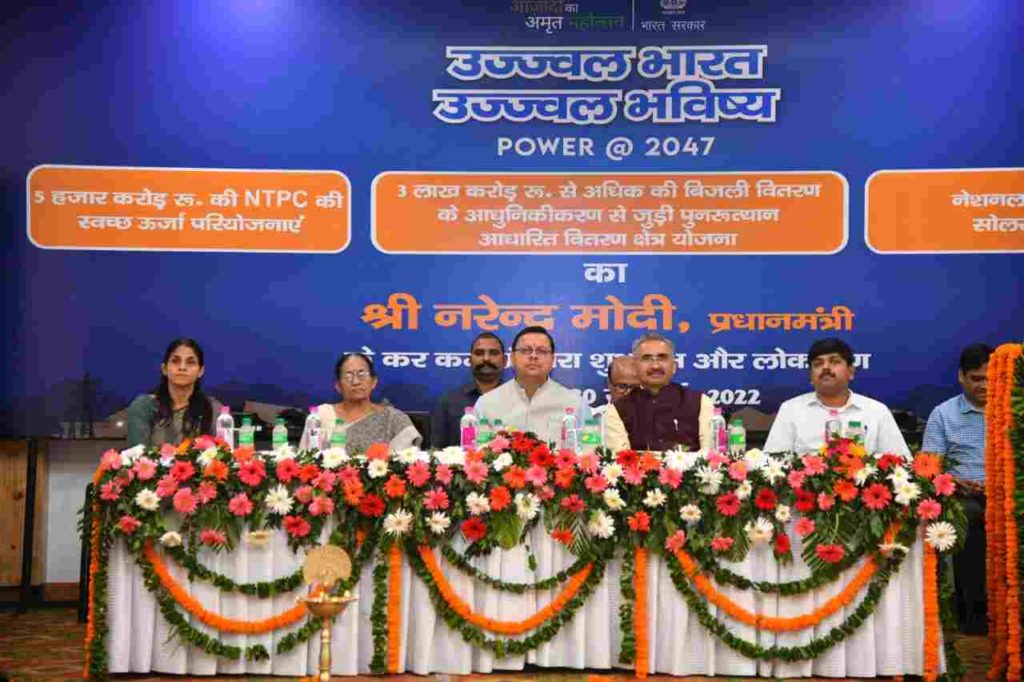 देहरादून: प्रधानमंत्री नरेंद्र मोदी ने शनिवार को वीडियो कॉन्फ्रेंसिंग के माध्यम से आजादी के अमृत महोत्सव के तहत ’उज्ज्वल भारत उज्ज्वल भविष्य – पावर @ 2047’ के समापन समारोह कार्यक्रम में पुनर्निर्मित वितरण क्षेत्र योजना का शुभारंभ किया। एनटीपीसी की विभिन्न हरित ऊर्जा परियोजनाओं का शिलान्यास तथा लोकार्पण एवं नेशनल रूफटॉप सोलर पोर्टल को भी प्रधानमंत्री द्वारा लांच किया गया। मुख्यमंत्री पुष्कर सिंह धामी ने मुख्यमंत्री आवास स्थित मुख्य सेवक सदन में इस कार्यक्रम में वर्चुअल प्रतिभाग किया। कार्यक्रम में केन्द्रीय मंत्री, विभिन्न राज्यों के मुख्यमंत्री भी जुड़े थे।