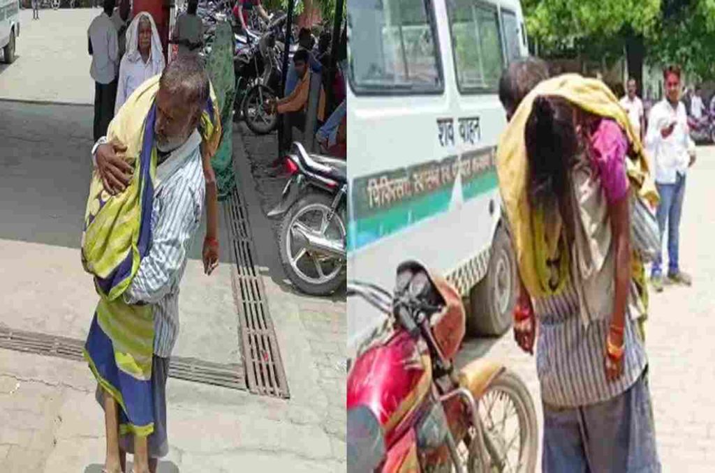 शव वाहन तो दूर अस्पताल प्रशासन ने स्ट्रैचर तक नहीं दिया. परिवार वाले एंबुलेंस तलाशते रहे तो पति कंधे पर पत्नी का शव लटकाए घूमता रहा. आखिरकार प्राइवेट एंबुलेंस से शव को परिजन घर ले गए. pic.twitter.com/ZmiOZL9z9d