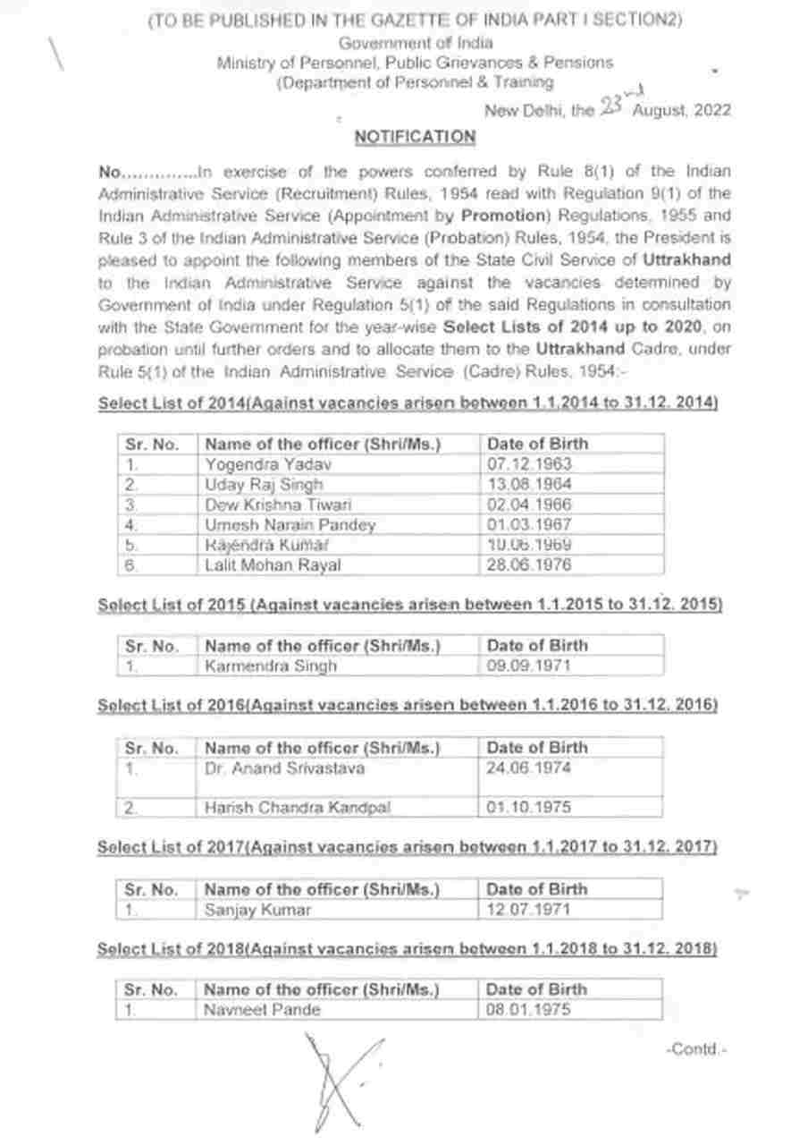 देहरादून। प्रदेश के 16 पीसीएस अधिकारी आइएएस (IAS) बन गए हैं। आज मंगलवार को केंद्र सरकार ने नोटिफिकेशन जारी किया है। इससे पीसीएस अधिकारियों की वर्षों पुरानी इच्छा पूरी हो गई है। पीसीएस अधिकारियों की वरिष्ठता के विवाद के निपटारे में लगभग 11 वर्ष बीत गए। सीधी भर्ती से नियुक्त और पदोन्नत पीसीएस अधिकारियों के बीच वरिष्ठता विवाद वर्ष 2011 से चल रहा था। सरकार ने अधिकारियों को पदोन्नत वेतनमान तो दिया, लेकिन पदोन्नति से वंचित रखा।
