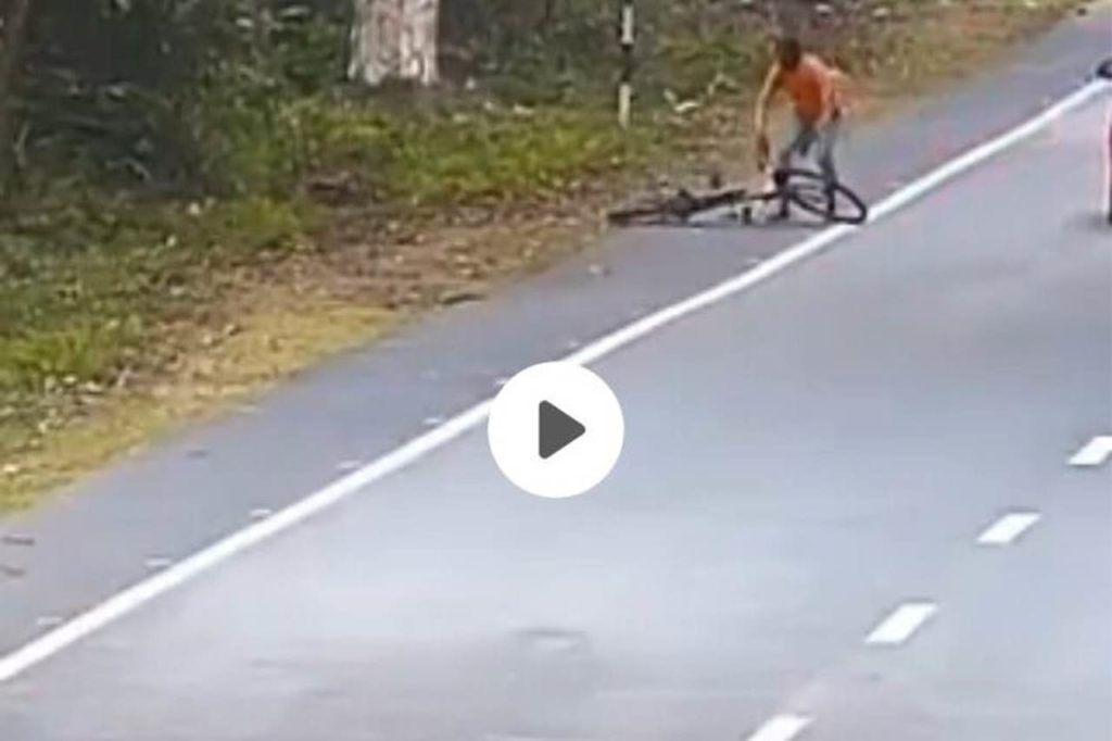 वायरल वीडियो में देखा जा सकता है कि एक शख्स साइकिल जा जंगल बीच से गुजर रहा होता है। हालांकि ये नेशनल हाइवे का है। इसी बीच अचानक जंगल से एक तेंदुआ झाड़ियों से कूदता हुआ और शख्स पर झपट पड़ता हैं। गनिमत ये है कि साइकिल सवार को कुछ नहीं होता और तेंदुआ तत्काल वापस जंगल में चला जाता है।