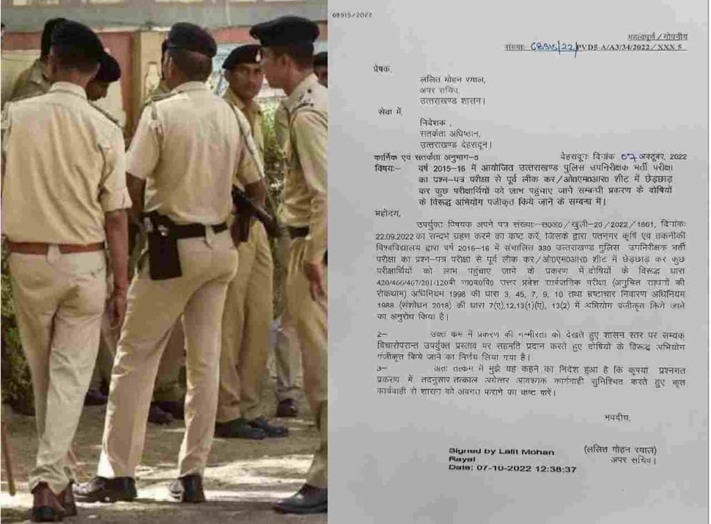 मामले में दोषियों के खिलाफ मुकदमा दर्ज करने के लिए शासन से अनुमति मांगी गई थी, जिसे विचार करने के बाद अब दे दिया गया है. इस संदर्भ में अपर सचिव ललित मोहन रयाल ने विजिलेंस निदेशक को पत्र लिखकर मामले में दोषियों के खिलाफ मुकदमा दर्ज करने की अनुमति देने की जानकारी दी है. दरअसल, पंतनगर कृषि एवं तकनीकी विश्वविद्यालय द्वारा 2015 में 339 उत्तराखंड पुलिस उप निरीक्षक भर्ती परीक्षा करवाई गई, जिसमें पेपर लीक और ओएमआर शीट में छेड़छाड़ करने की बात सामने आई है.