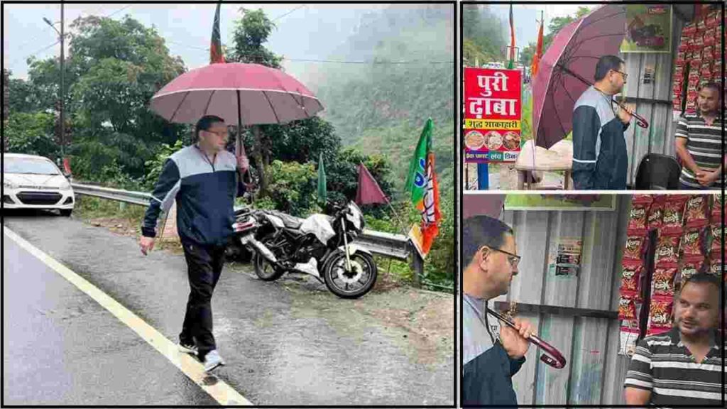 रुद्रप्रयाग: आज सुबह भारी बारिश के बावजूद सीएम पुष्कर धामी ने तिलवाड़ा गेस्ट हाउस से आगे की सैर की. उन्होंने छाता लेकर पैदल चलते हुए स्थानीय लोगों और तीर्थयात्रियों से बातचीत की. मुख्यमंत्री ने केदारनाथ हाईवे पर स्थित पुरी ढाबे में कार्यरत विजय पंवार से भी बातचीत की और ढाबा संचालक से जानकारी ली कि इस बार उनका कारोबार कैसा रहा, यात्रा कैसे चली. इससे आपको कितना लाभ हुआ. वहीं सुबह-सुबह सीएम धामी को अपने पास देख व्यापारी हक्के-बक्के रह गए. गौर हो कि उत्तराखंड के मुख्यमंत्री पुष्कर सिंह धामी ने शनिवार को रुद्रप्रयाग जिले के एक दिवसीय दौरे पर पहुंचे. यहां पहुंचकर जहां सीएम धामी ने करोड़ों की विकास योजनाओं का शिलान्यास व लोकार्पण किया, वहीं देर रात अधिकारियों की बैठक लेते हुए कड़े निर्देश भी दिए. साथ ही सीएम धामी ने भाजपा कार्यकर्ताओं से भी मुलाकात की.