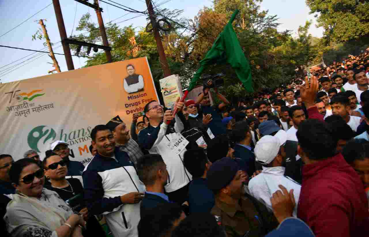 देहरादूनः आजादी का अमृत महोत्सव के तहत रन फॉर यूनिटी अगेंस्ट ड्रग्स (Run For Unity Against Drugs) को लेकर देहरादून मैराथन 2022 का आयोजन किया गया. जहां मुख्यमंत्री पुष्कर सिंह धामी ने प्रतिभागियों को हरी झंडी दिखाकर रवाना किया. खुद सीएम धामी, डीजीपी अशोक कुमार ने भी दौड़ लगाई. मैराथन में 12 देशों के एथलीट समेत देश के विभिन्न राज्यों और केंद्र शासित प्रदेशों के प्रतिभागियों ने हिस्सा लिया. वहीं, भारतीय प्लेबैक सिंगर और संगीतकार कैलाश खेर (Singer Kailash Kher) ने अपनी प्रस्तुतियां दी. दरअसल, उत्तराखंड को साल 2025 तक नशा मुक्त करने का लक्ष्य (Mission Drugs Free Devboomi) रखा गया है. इसी कड़ी में उत्तराखंड पुलिस और द हंस फाउंडेशन की ओर से देहरादून मैराथन के चौथे संस्करण (Dehradun Marathon 2022) का आयोजन कराया जा रहा है. इस मैराथन में भाग लेने के लिए 12 देशों के 104 विदेशी एथलीट, भारत के 24 राज्यों के अलावा 4 केंद्र शासित प्रदेश के 13,540 प्रतिभागियों ने हिस्सा लिया.