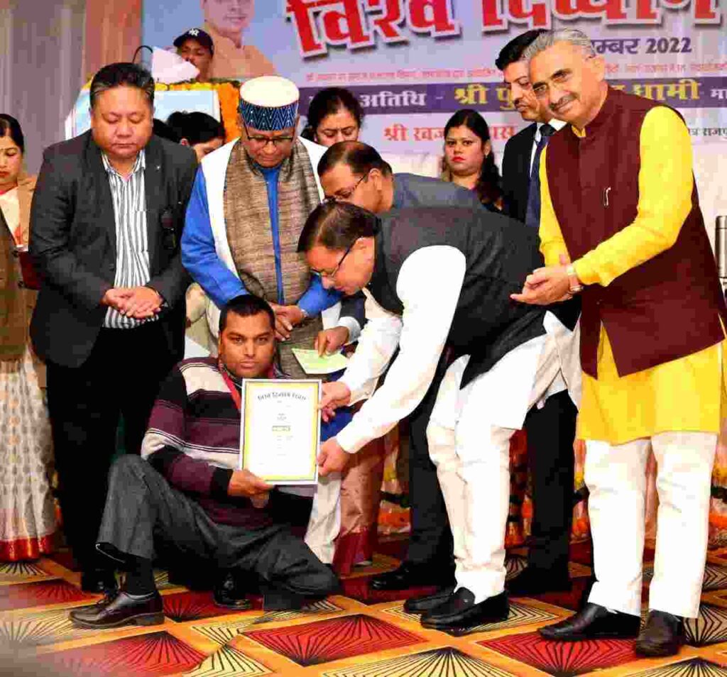 देहरादून: विश्व दिव्यांग दिवस के मौके पर मुख्यमंत्री पुष्कर सिंह धामी ने देहरादून (Dehradun) में दिव्यांगों के लिए आयोजित कार्यक्रम में प्रतिभाग किया. इस दौरान मुख्यमंत्री ने दिव्यांगों को लेकर कई सारी घोषणाएं भी की. मुख्यमंत्री ने कहा कि दिव्यांगों को मुख्यधारा से जोड़ने के लिए सरकार कई सारी योजनाओं पर काम कर रही है. दिव्यांगों की प्रतिभाएं हर क्षेत्र में देखने को मिल रही है. सरकार ने उनकी सम्मान राशि में भी इजाफा किया है. सीएम ने इस दौरान दिव्यांग जनों के लिए चार बड़ी घोषणाएं भी की है. दिव्यांगजनो को कृत्रिम अंगों के लिए दी जाने वाली अनुदान राशि 3,500 से बढ़ाकर 7,000 रु की गई. दिव्यांग पेंशन योजना को सरलीकृत करते हुए सभी दिव्यांग जन पेंशन के पात्र किए गए. परीक्षाओं में उत्तीर्ण अंकों में 5 प्रतिशत की छूट दी गयी. दिव्यांग व्यक्तियों के सेवायोजक अधिकारियों की राज्य स्तरीय पुरस्कार राशि 5 हजार से बढ़ाकर 8 हजार की गई.
