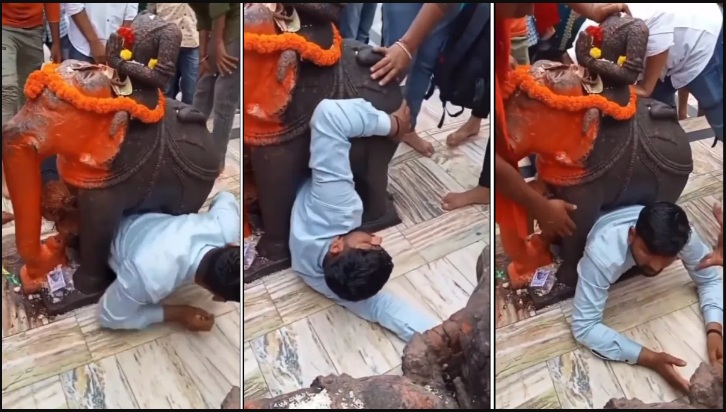 वायरल हो रहे वीडियो में दिख रहा है कि एक व्यक्ति मंदिर में लगी हाथी की मूर्ति के नीचे पेट के सहारे निकल रहा होता है. जैसे ही वो मूर्ति के नीचे से आधा पार होता है, वो बीच में फंस जाता है. अब वो ना इधर का रहता है और ना उधर का. वो निकलने की काफी कोशिश करता है लेकिन तमाम कोशिशों के बाद भी असफल रहता है. आसपास के लोग उसे बाहर निकालने की कोशिश करते हैं. वहीं आसपास में खड़े कुछ लोग हंसने लगते हैं. पहले आप भी ये वायरल वीडियो देखिए…