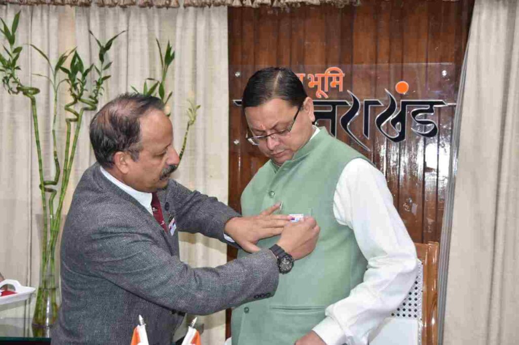 देहरादून: सशस्त्र सेना झंडा दिवस’ के अवसर पर मुख्यमंत्री आवास में सैनिक कल्याण एवं पुनर्वास निदेशालय के निदेशक ब्रिगेडियर अमृत लाल (से.नि.) उप निदेशक कर्नल एम.एस.जोधा (से.नि) ने मुख्यमंत्री पुष्कर सिंह धामी को फ्लैग लगाया।