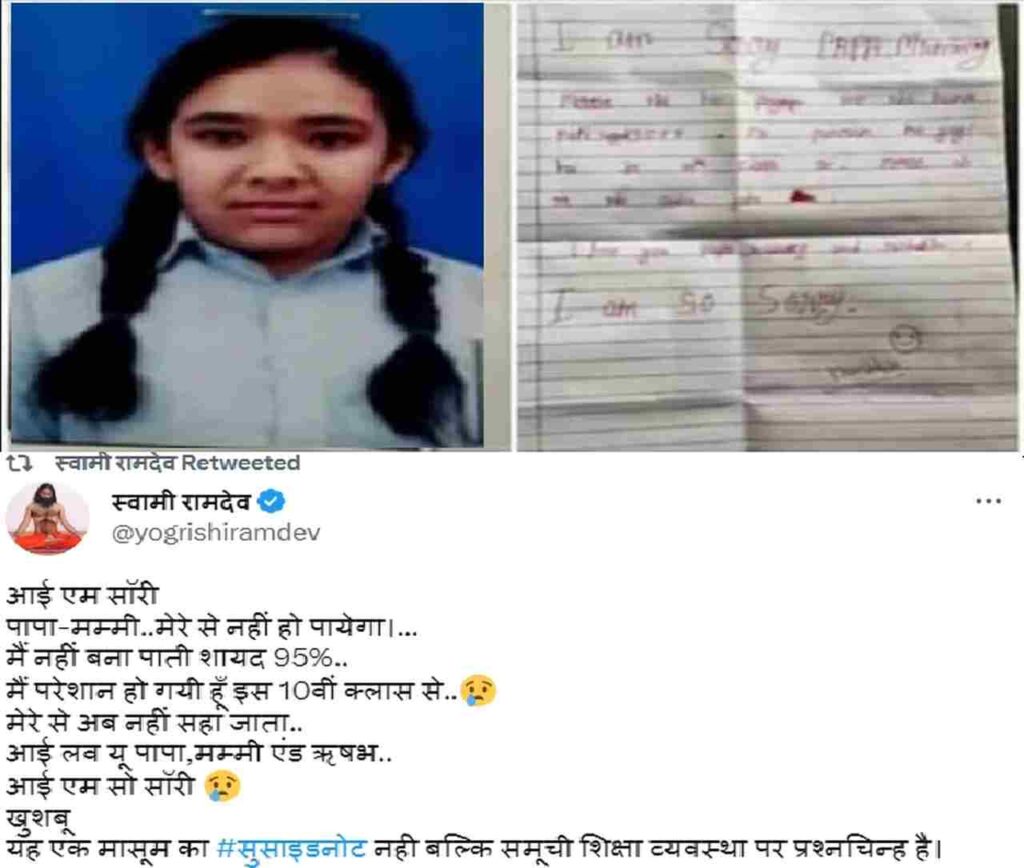 यह एक मासूम का #सुसाइडनोट नही बल्कि समूची शिक्षा व्यवस्था पर प्रश्नचिन्ह है। pic.twitter.com/dyAD54MCua— स्वामी रामदेव (@yogrishiramdev) March 4, 2023