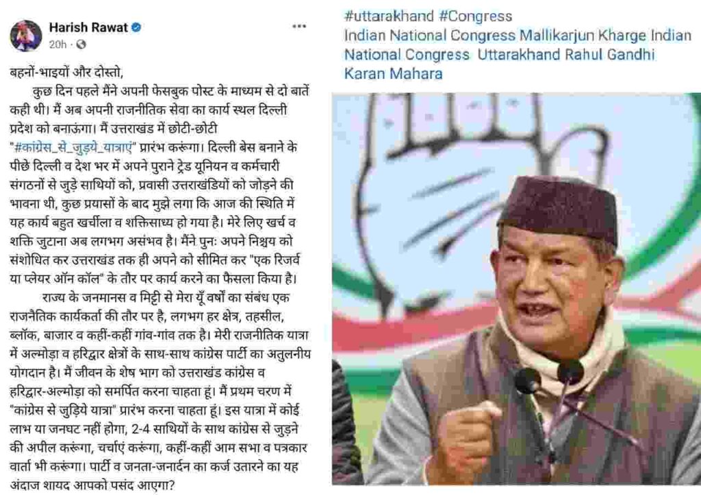 देहरादून। पूर्व सीएम हरीश रावत ने उत्तराखंड में कांग्रेस से जुड़िए यात्रा प्रारंभ करने की घोषणा की है। रावत के मुताबिक अब वो अपना समय उत्तराखंड और खासकर हरिद्वार- अल्मोड़ा को देंगे। सोशल मीडिया पोस्ट में हरीश रावत ने लिखा है कि अब वो अपने को उत्तराखंड तक ही सीमित करते हुए एक रिजर्व प्लेयर के तौर पर रखेंगे रावत के मुताबिक उनकी राजनीतिक पारी में कांग्रेस पार्टी के साथ ही अल्मोड़ा और हरिद्वार का विशेष योगदान रहा है। इसलिए वो इन दो जिलों पर खासकर फोकस करेंगे साथ ही पूरे प्रदेश भर में कांग्रेस से जुड़िये यात्रा करेंगे। उन्होंने कहा कि इस यात्रा में बड़ा लाव तरकर नहीं होगा वो ये चार साथियों के साथ यात्रा करते हुए, लोगों से संवाद करेंगे। इससे के जरिए वो जनता का कर्ज उतारने का प्रयास करेंगे।