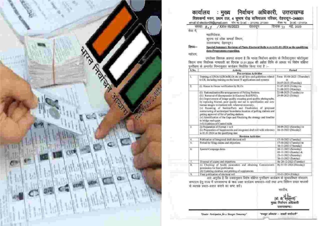 देहरादून: मुख्य निर्वाचन अधिकारी उत्तराखण्ड डॉ वी षणमुगम ने जानकारी दी है कि भारत निर्वाचन आयोग के निर्देशानुसार फोटोयुक्त विधान सभा निर्वाचक नामावली का 01 जनवरी 2024 की अर्हता तिथि के आधार पर विशेष संक्षिप्त पुनरीक्षण के तहत विभिन्न कार्यक्रम निर्धारित किए गए हैं। सभी निर्वाचक रजिस्ट्रीकरण अधिकारियों, सहायक निर्वाचक रजिस्ट्रीकरण अधिकारियों, बूथ लेवल ऑफिसर्स हेतु निर्वाचक नामावली से सम्बन्धित सभी कानूनों व दिशा निर्देशों के प्रशिक्षण की व्यवस्था तथा आईटी एप्लीकेशन व सिस्टम की ट्रेनिंग 01 जून 2023 से 20 जुलाई 2023 तक दी जाएगी। बूथ लेवल ऑफिसर्स द्वारा घर-घर जाकर सत्यापन 21 जुलाई 2023 से 21 अगस्त 2023 तक किया जाएगा। पोलिंग स्टेशन का सुव्यवस्थीकरण एवं पुनः व्यवस्था, निर्वाचक नामावली तथा मतदाता पहचान पत्रों में मौजूद गलतियों में सुधार, अच्छी गुणवत्ता वाली फोटो अपडेट, पोलिंग स्टेशन की सूची का अनुमोदन प्राप्त करना, कन्ट्रोल टेबल का अद्यतीकरण जैसे कार्य 22 अगस्त 2023 से 29 सितम्बर 2023 तक सम्पन्न किए जाएंगे।