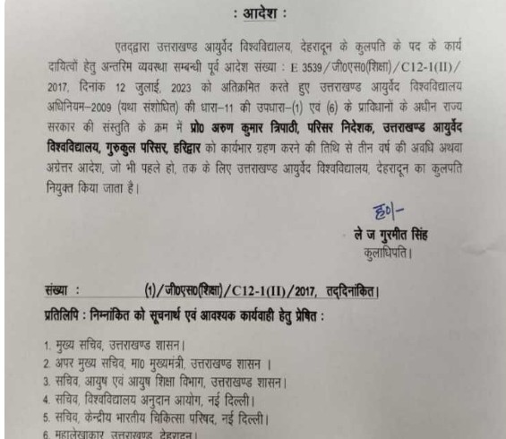 आयुर्वेद विश्वविद्यालय में कुलपति पद को लेकर हाईकोर्ट के आदेश के बाद राज्यपाल ने आदेश जारी कर दिया है। फिलहाल आयुर्वेद निदेशालय में निदेशक की जिम्मेदारी देख रहे प्रोफेसर अरुण कुमार त्रिपाठी को कार्यवाहक कुलपति के तौर पर जिम्मेदारी दी गई है।