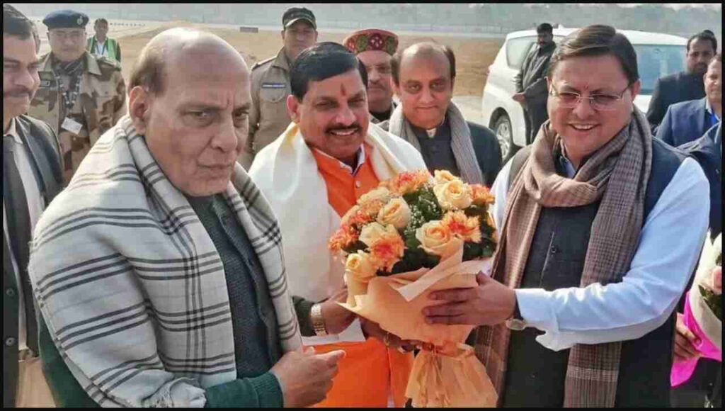 मुख्यमंत्री धामी ने लिखा कि नैसर्गिक सौंदर्य से परिपूर्ण आध्यात्मिक भूमि, शौर्य एवं पराक्रम की धरा “देवभूमि” उत्तराखण्ड आगमन पर आदरणीय केंद्रीय रक्षा मंत्री श्री राजनाथ सिंह जी का जौलीग्रांट एयरपोर्ट पर हार्दिक स्वागत एवं अभिनंदन किया। इस अवसर पर मध्यप्रदेश के नवनिर्वाचित मुख्यमंत्री डॉ. मोहन यादव जी का भी देवभूमि आगमन पर स्वागत किया।