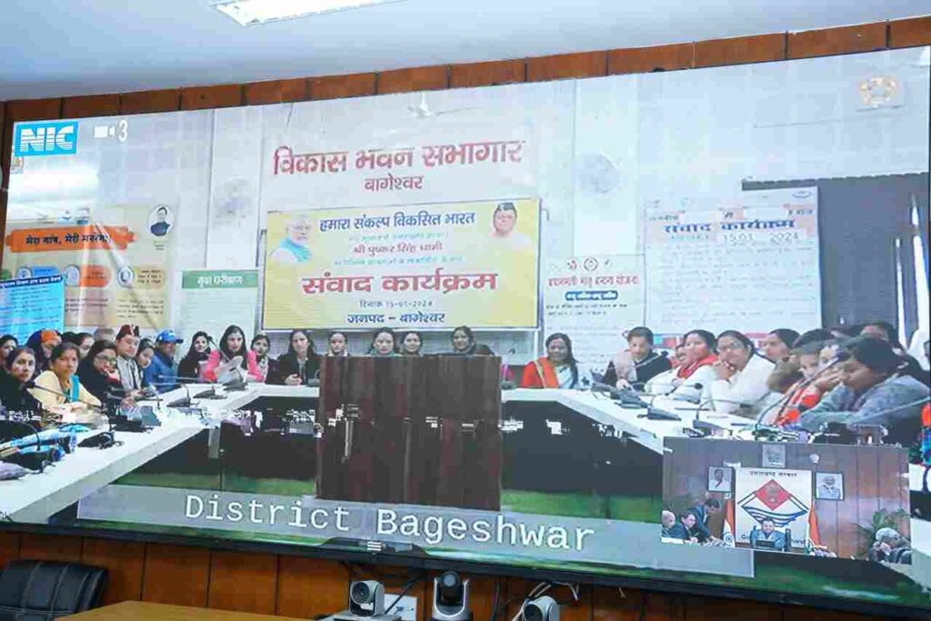 देहरादून : मुख्यमंत्री पुष्कर सिंह धामी ने सोमवार को सचिवालय से वर्चुअल माध्यम से विकसित भारत संकल्प यात्रा के तहत जनपद बागेश्वर की महिला लाभार्थियों से संवाद किया। इस अवसर पर मुख्यमंत्री ने 05 महिला लाभार्थियों से संवाद कर उनके विचार भी जाने। लाभार्थियों ने केन्द्र एवं राज्य की विभिन्न योजनाओं के तहत उन्हें मिली सुविधाओं के प्रति प्रधानमंत्री तथा मुख्यमंत्री का आभार भी व्यक्त किया।