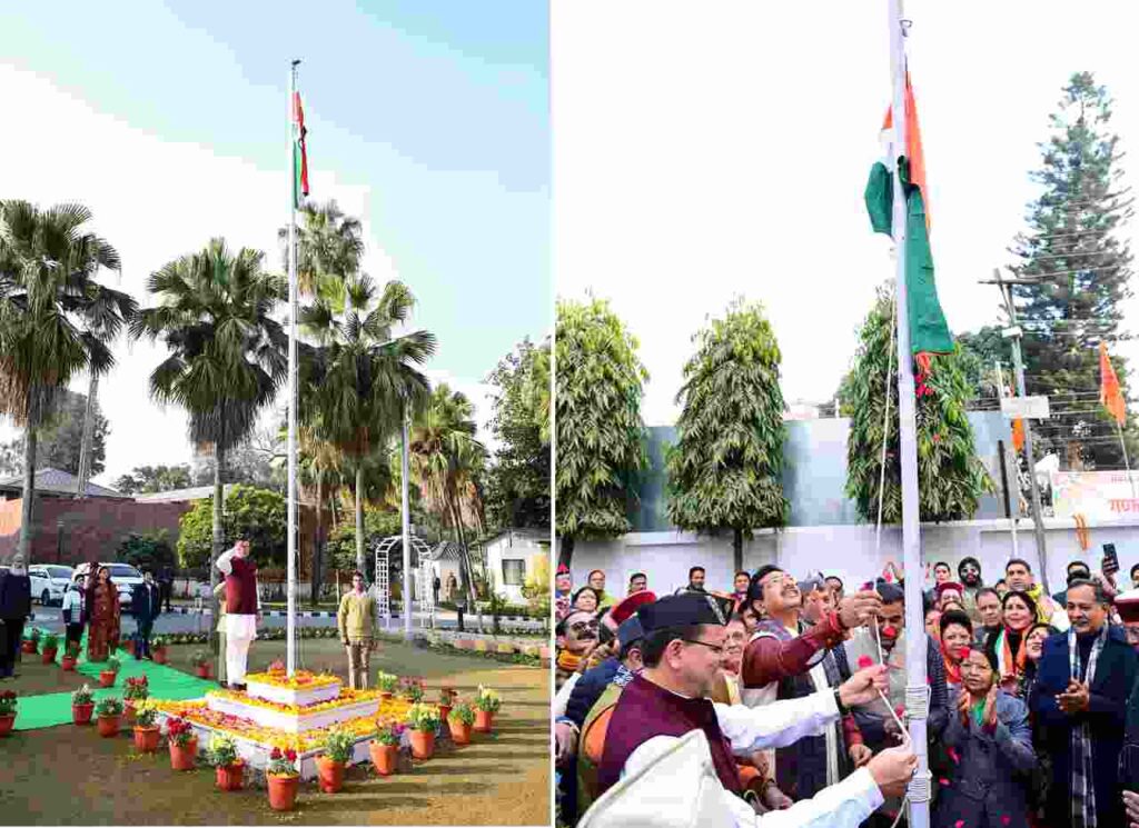 देहरादून: मुख्यमंत्री पुष्कर सिंह धामी ने गणतंत्र दिवस के अवसर पर मुख्यमंत्री आवास में राष्ट्रीय ध्वज फहराया। इस अवसर पर उन्होंने सभी को संविधान की उद्देशिका की शपथ दिलाई। मुख्यमंत्री पुष्कर सिंह धामी ने सभी प्रदेशवासियों को गणतंत्र दिवस की शुभकामना देते हुए कहा कि प्रधानमंत्री नरेन्द्र मोदी जी के एक भारत, श्रेष्ठ भारत के संकल्प को पूरा करने के लिए हम सबको मिलकर योगदान देना होगा। उन्होंने कहा कि प्रधानमंत्री नरेंद्र मोदी के साढ़े नौ साल के कार्यकाल में हर वर्ग को ध्यान में रखते हुए योजनाओं का लाभ दिया गया। महिला सशक्तिकरण की दिशा में अनेक कार्य हुए है। नारी शक्ति वंदन अधिनियम पारित हुआ। मातृशक्ति को सशक्त बनाने के लिए लखपति दीदी योजना के तहत तेजी से कार्य हुए हैं।