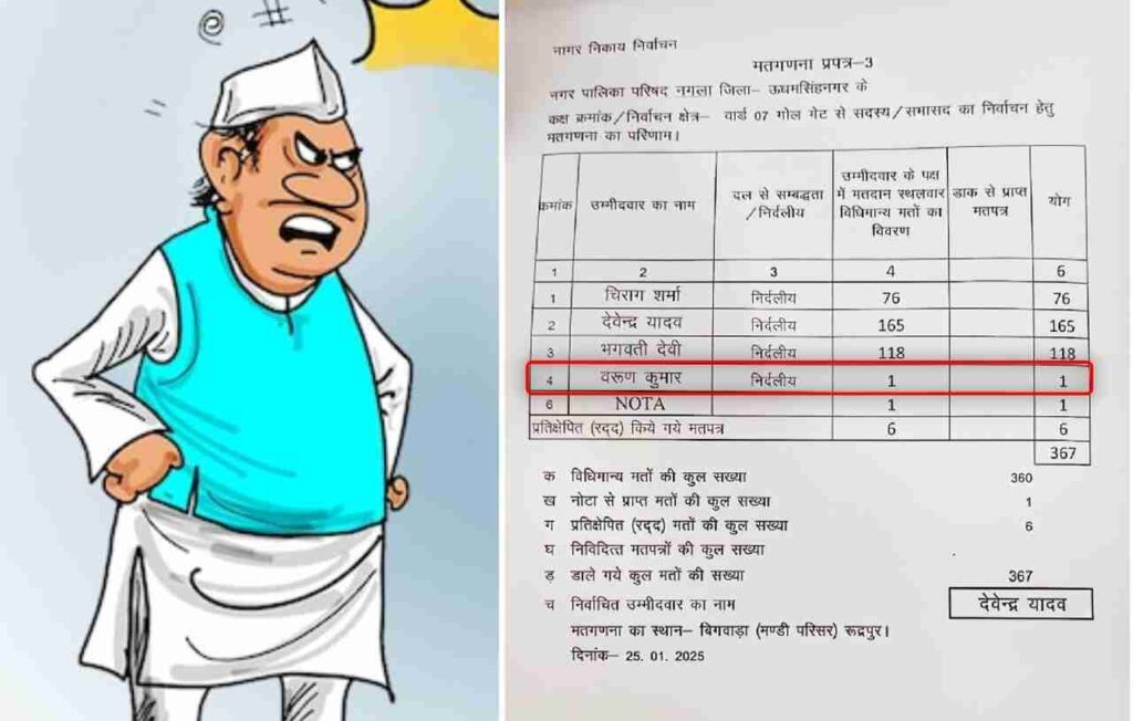 उधम सिंह नगर जिले में अस्तित्व में आने के बाद नगर नगर पालिका में पहली बार चुनाव हुए. 7 वार्ड की नगर पालिका में वार्ड मेंबरों ने पूरे दमखम के साथ चुनाव लड़ा. जैसे ही मतगणना हुई तो वार्ड 7 गोलगेट से सभासद का चुनाव लड़ रहे चार निर्दलीय प्रत्याशियों की धड़कन तेज होने लगी, लेकिन मजे की बात तो ये थी कि 367 वोटरों की संख्या वाले वार्ड में निर्दलीय प्रत्याशी वरुण कुमार को महज एक वोट ही पड़े. उन्हें अपनों ने तक वोट नहीं किया.