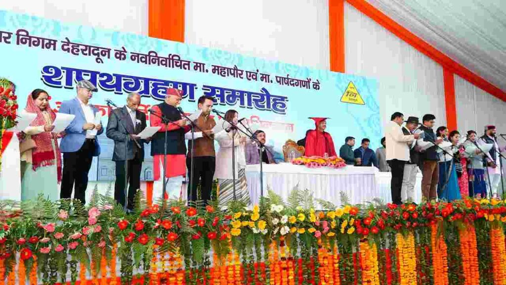देहरादून: नगर निकाय चुनाव संपन्न होने के बाद शुक्रवार को प्रदेश भर के सभी नगर निगमों में शपथ ग्रहण समारोह का आयोजित किया गया. इसी क्रम में देहरादून नगर निगम परिसर में शपथ ग्रहण समारोह का आयोजन किया गया. जहां देहरादून नगर निगम के नवनिर्वाचित मेयर के साथ 100 पार्षदों ने पद और गोपनीयता की शपथ ली. गढ़वाल कमिश्नर विनय शंकर पांडेय ने नवनिर्वाचित मेयर सौरभ थपलियाल को मेयर पद की शपथ दिलाई. मेयर ने नवनिर्वाचित पार्षदों को पद और गोपनीयता की शपथ दिलाई.