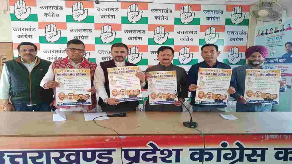 देहरादून: मतदाता सूची में गड़बड़ी को लेकर कांग्रेस पार्टी ने आज मेरा वोट मेरा अधिकार कार्यक्रम का पोस्टर लांच किया है. कांग्रेस प्रदेश अध्यक्ष करन माहरा की मौजूदगी में कांग्रेस प्रदेश मुख्यालय में कार्यक्रम का पोस्टर लांच किया गया. इस मौके पर कांग्रेस पार्टी की ओर से गठित की गई उत्तराखंड मानवाधिकार संरक्षण समिति ने वोटरों की शिकायत के लिए ईमेल meravote@inc.in और व्हाट्सएप नंबर 74528 94623 भी जारी किया.