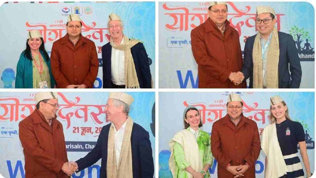 गैरसेण: मुख्यमंत्री पुष्कर सिंह धामी ने शुक्रवार को भराड़ीसैंण, गैरसैंण में अंतर्राष्ट्रीय योग दिवस की पूर्व संध्या पर आयोजित कार्यक्रम में प्रतिभाग करते हुए सभी विदेशी राजनयिकों और सुप्रसिद्ध योगाचार्य का स्वागत किया। उन्होंने इस दौरान सभी को प्रतीक चिन्ह और उत्तराखंडी टोपी देकर सम्मानित भी किया। मुख्यमंत्री पुष्कर सिंह धामी ने मेक्सिको, फिजी, नेपाल, सूरीनाम, मंगोलिया, लातविया, श्रीलंका और रूस के उपस्थित राजदूत व अन्य उच्चधिकारियों का स्वागत करते हुए कहा कि देवभूमि उत्तराखंड योग और आयुष की वैश्विक राजधानी है। प्रधानमंत्री नरेद्र मोदी जी के नेतृत्व और आग्रह पर पूरी दुनिया में अंतर्राष्ट्रीय योग दिवस मनाया जाता है। 2014 में प्रधानमंत्री जी के आग्रह पर संयुक्त राष्ट्र संघ में 177 से ज्यादा देशों ने अंतर्राष्ट्रीय योग दिवस को मान्यता दी।