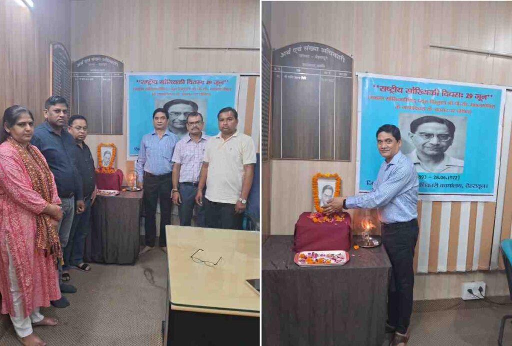 देहरादून: 19वें राष्ट्रीय सांख्यिकी दिवस के अवसर पर जिला अर्थ एवं संख्याधिकारी कार्यालय, विकास भवन, देहरादून में पद्म विभूषण सांख्यिकीविद् प्रशान्त चन्द्र महालनोबिस के 132वें जन्म दिवस पर राष्ट्रीय सांख्यिकी दिवस मनाया गया। जिला अर्थ एवं संख्याधिकारी, शशि कान्त गिरि द्वारा महालनोबिस की फोटो पर माल्यार्पण कर दीप प्रज्जवलित किया गया, तत्पश्चात् कार्यालय के समस्त अधिकारियों/कर्मचारियों द्वारा श्रद्धा सुमन के पुष्प अर्पित किये गये।