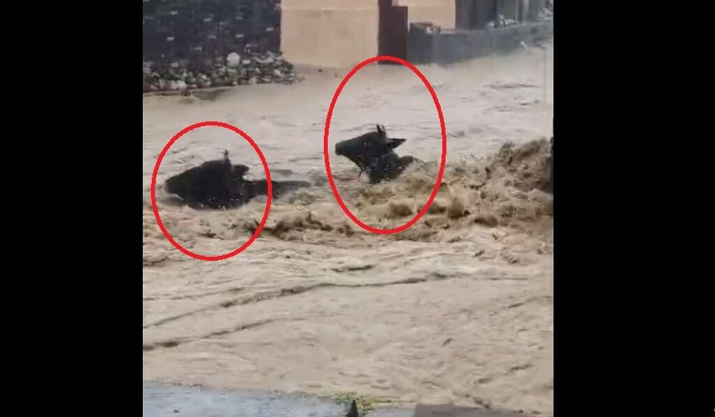 देहरादून के कई इलाकों में बाढ़ जैसे हालात: बारिश का सबसे ज्यादा कहर देहरादून के नालापानी क्षेत्र में देखने को मिलेगा. आधा दर्जन से ज्यादा गाय एक के बाद एक बहती नजर आ रही है. इस दौरान गाय पानी से निकलने के लिए छटपटाती हुई भी नजर आ रही है, लेकिन पानी का बहाव इतना तेज था कि किसी की भी हिम्मत गायों को बचाने की नहीं हो रही थी.