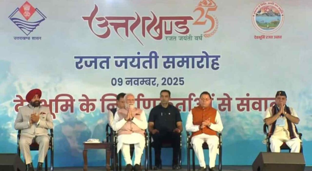 देहरादून: उत्तराखंड राज्य स्थापना के आज 25 वर्ष पूरे हो चुके हैं। एफआरआई में आयोजित मुख्य कार्यक्रम में आज प्रधानमंत्री नरेंद्र मोदी भी शामिल हुए। उन्होंने एक स्मारक डाक टिकट जारी करने के साथ ही जनसमूह को संबोधित भी किया। इसके साथ ही रजत जयंती समारोह में प्रदेश को 8260 करोड़ की योजनाओं की सौगात भी दी। कहा विकास की यात्रा अद्भुत रही है। यह हर उत्तराखंडी के संकल्प का नतीजा है।
