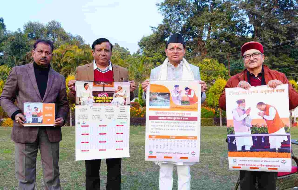देहरादून: मुख्यमंत्री पुष्कर सिंह धामी ने मुख्यमंत्री आवास में सूचना विभाग, उत्तराखंड सरकार द्वारा प्रकाशित नववर्ष 2026 के आधिकारिक कैलेंडर का विधिवत विमोचन किया। इस अवसर पर मुख्यमंत्री ने कैलेंडर के आकर्षक स्वरूप, उत्कृष्ट मुद्रण गुणवत्ता एवं विषयवस्तु की सराहना करते हुए कहा कि यह कैलेंडर राज्य सरकार की योजनाओं, उपलब्धियों तथा जनकल्याणकारी नीतियों के साथ-साथ सरकार द्वारा लिए गए ऐतिहासिक एवं दूरदर्शी निर्णयों को प्रभावी ढंग से जनमानस तक पहुँचाने का सशक्त माध्यम है।