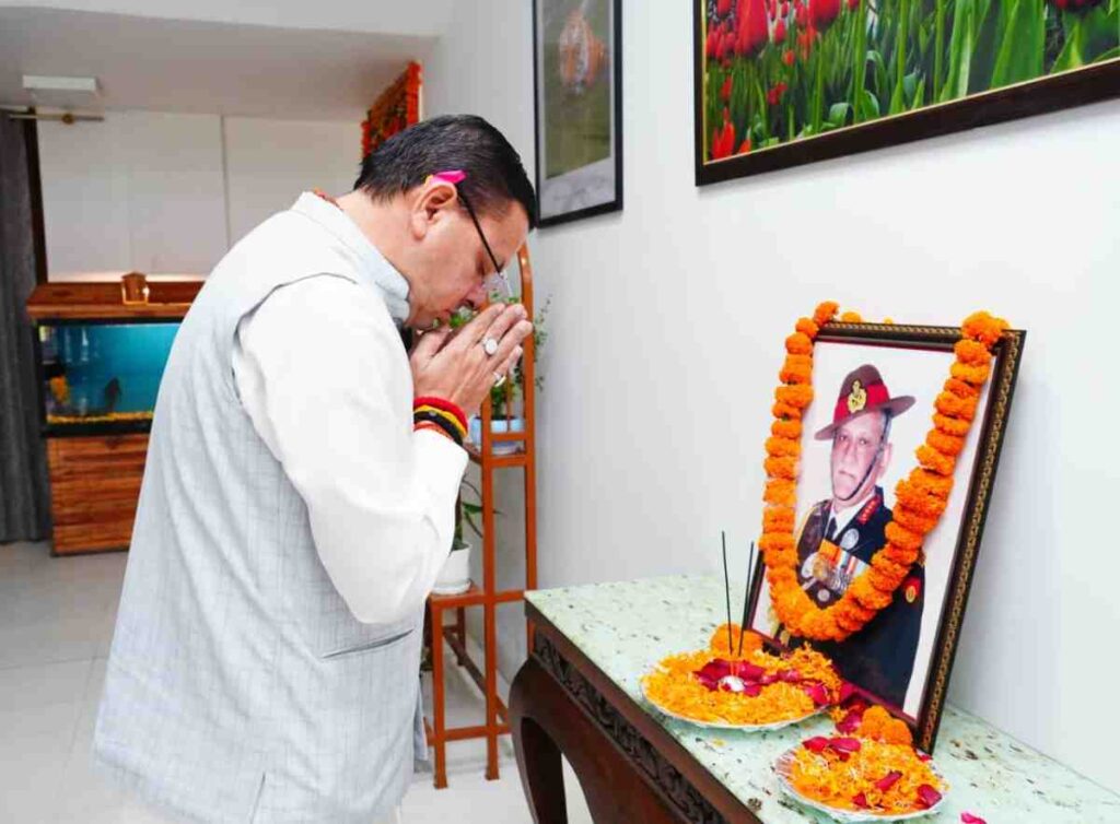 देहरादून। मुख्यमंत्री पुष्कर सिंह धामी ने भारत के प्रथम चीफ ऑफ डिफेंस स्टाफ, पद्म विभूषण से अलंकृत तथा उत्तराखंड के गौरव जनरल बिपिन रावत की जयंती पर मुख्यमंत्री आवास में उनके चित्र पर श्रद्धासुमन अर्पित कर भावपूर्ण स्मरण किया।